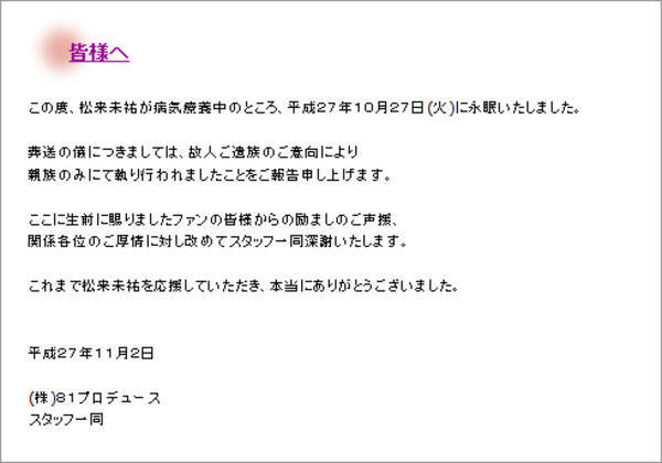 松来未祐日記 exciteブログ (15年9月14日) 17年6月3日 閲覧。 ^ 81プロデュース スタッフ一同 (15年12月15日) "松来未祐を応援してくださった皆様へ" 松来未祐日記 15年12月15日 閲覧。 ^ "声優の松来未祐さん 難病だった遺族が同じ病気の早期発見願い